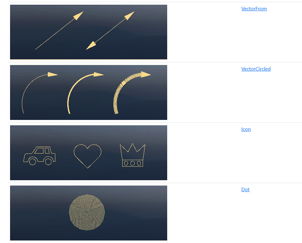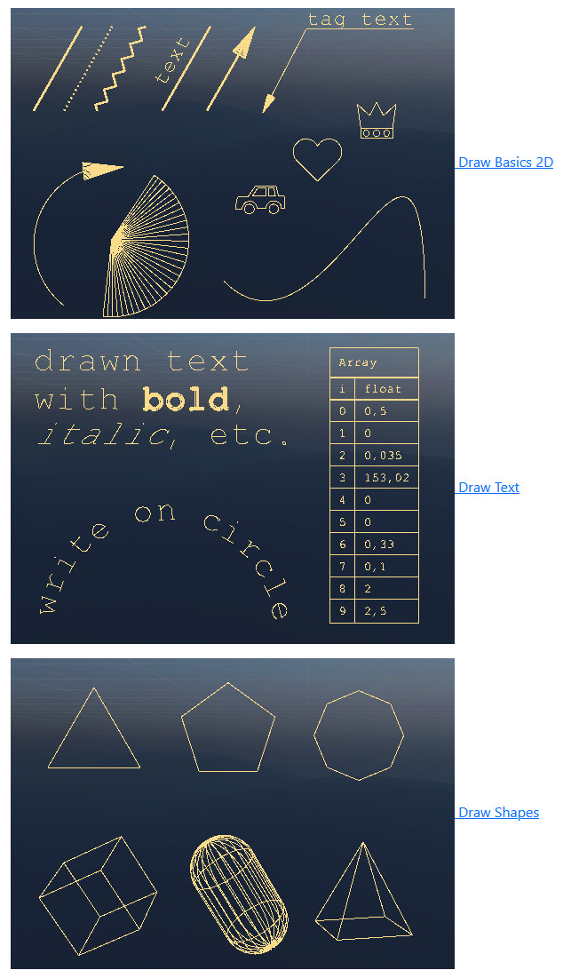 Now say you want to draw a vector to visualize the forward direction of a GameObject. On the API overview page you see that the category "Draw Basics" has a vector. After clicking on the Draw Basics category another page with many images opens. The images represent all shapes that you can draw inside the Draw Bascis category.