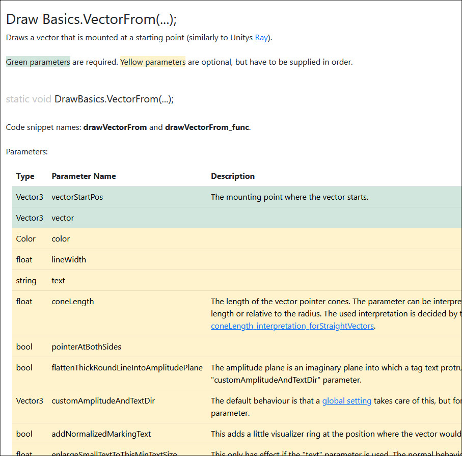 We can see from the function description the name of the vector draw function and the expected parameters. There are two mandatory parameters: "vectorStartPos" and "vector". These mandatory parameters are colored green in the API documentation. With that information we can craft our first drawing call to the Draw XXL library, like so: