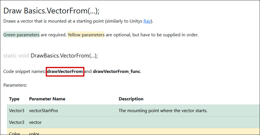 For example the "DrawBasics.VectorFrom()" has "drawVectorFrom" as code snippet name: