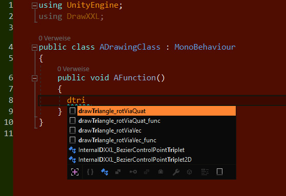 There is an extra installation step required (beside importing the Draw XXL package into your Unity project) in order to be able to use the code snippets. This installation step is described later.